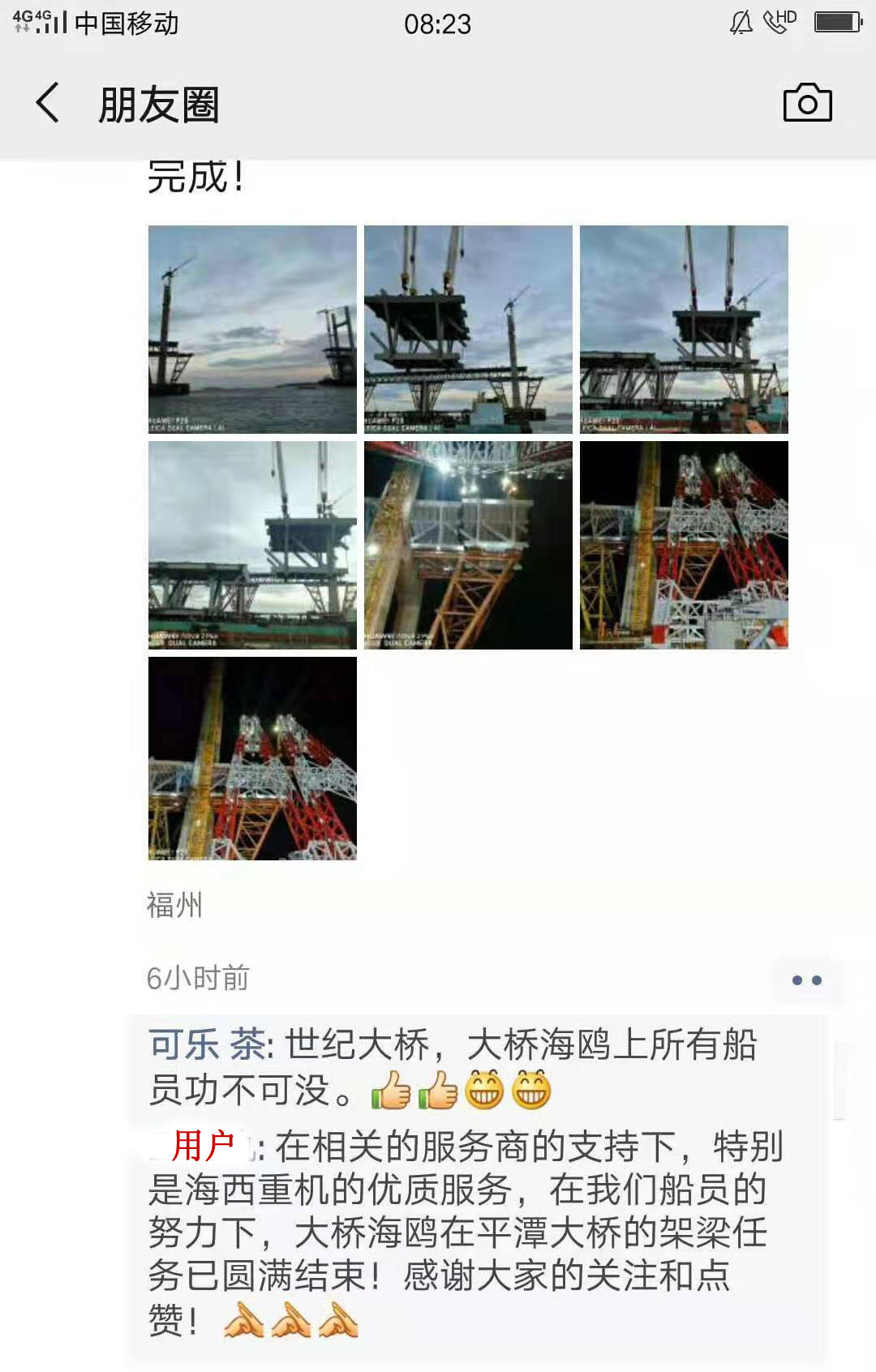 7月28日接到用戶通知,“大橋海鷗號”將于7月28日晚進行第64、65片8鋼梁的架設(shè)(單重達3200噸),為保證工程順利實施,請海西重機安排技術(shù)人員進行保駕護航,用船長的話就是“你們在現(xiàn)場,感到心里踏實”。公司當(dāng)即安排附近正在羅源灣碼頭做電控系統(tǒng)改造的宋靖浩工程師,前往現(xiàn)場。7月2900日傍晚5點,吊裝正式開始,各崗位人員各負(fù)其責(zé),密切配合。直到凌晨時分,2片鋼梁順利架設(shè)完成,設(shè)備運行一切正常,用戶對海西重機設(shè)備的穩(wěn)定性和服務(wù)的及時性給予了高度評價。至8月6日,平潭海峽公鐵大橋,最后一片鋼梁順利架設(shè)完成, “大橋海鷗號”不辱使命,圓滿完成任務(wù)。用戶喜悅的表揚,就是對我們優(yōu)質(zhì)服務(wù)的認(rèn)可和正反饋。