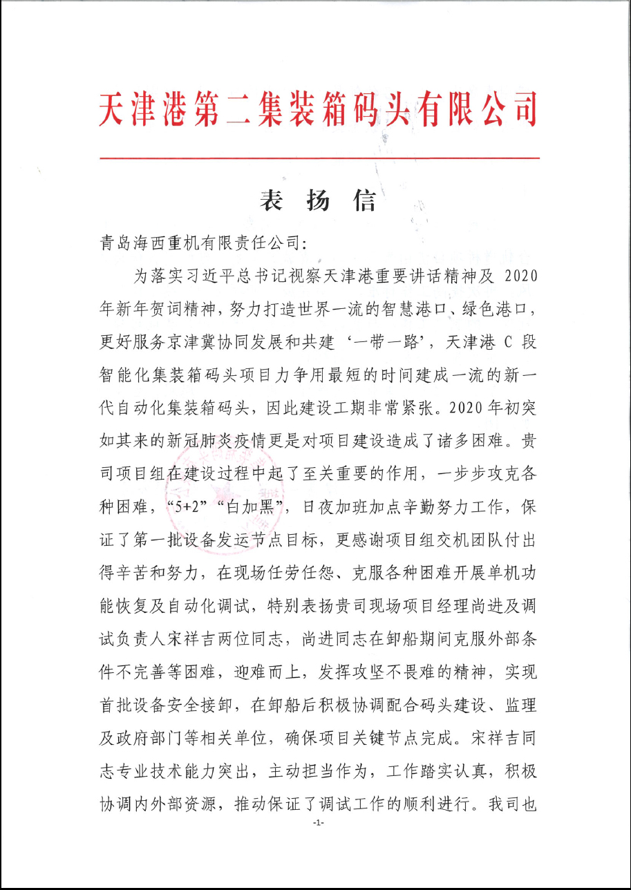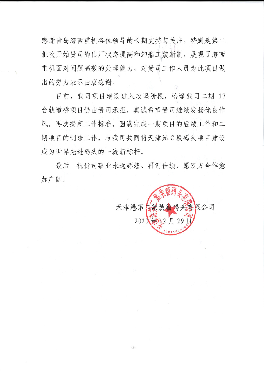 表揚信的最后,天津港業(yè)主也對海西重機領(lǐng)導(dǎo)班子對于此項目的關(guān)注與支持表達了特別感謝,對于海西重機承制的二期17臺軌道吊項目表達了高度信任和美好期許!
