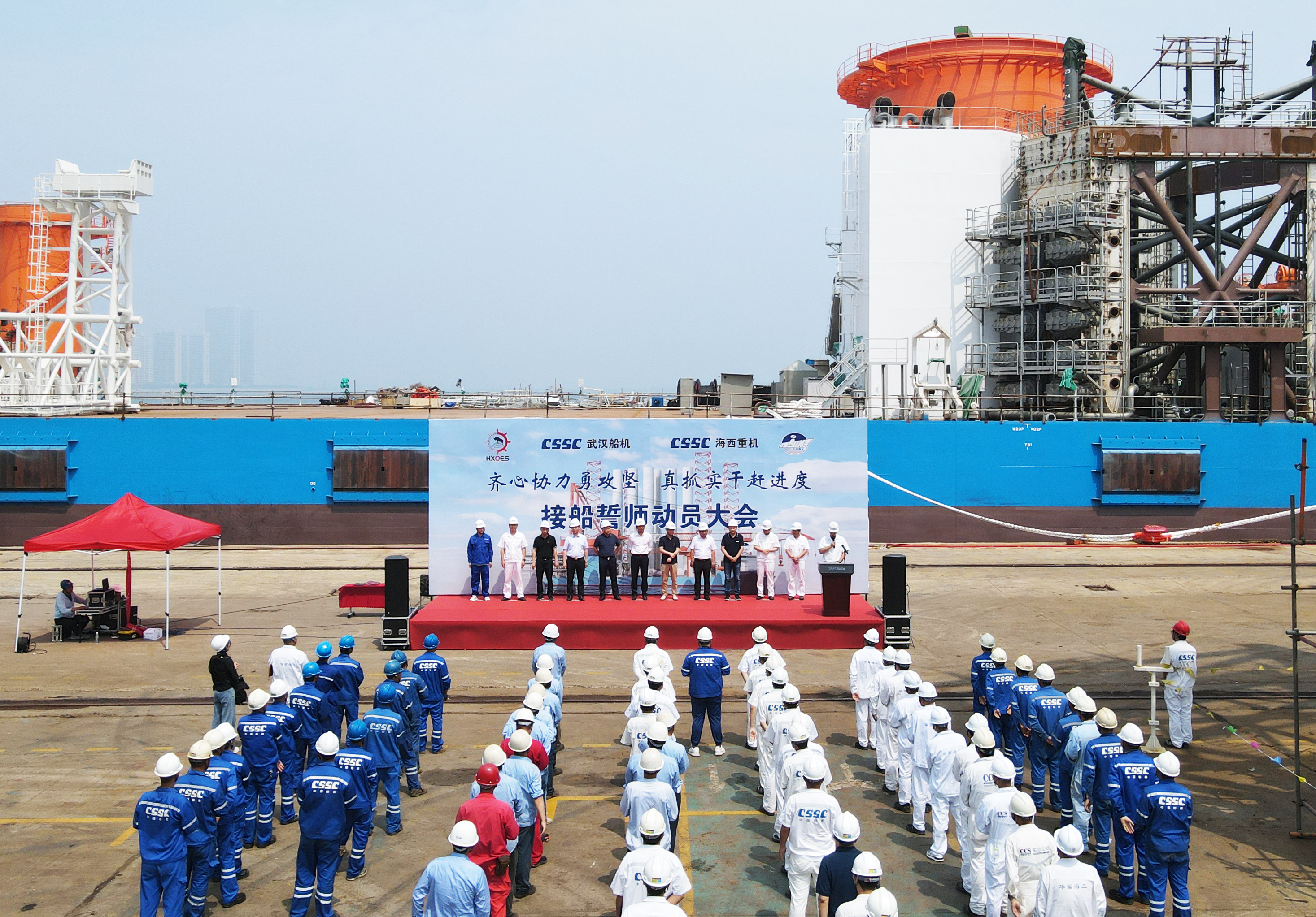武漢船機(jī)公司黨委書記、董事長馬聚勇作了動(dòng)員講話。馬聚勇強(qiáng)調(diào),華西海工1600T風(fēng)電安裝平臺(tái)項(xiàng)目作為公司承接的最新一代風(fēng)電安裝平臺(tái),能夠滿足未來深遠(yuǎn)海、大容量、一體化施工要求,對(duì)公司打造經(jīng)典產(chǎn)品、引領(lǐng)未來市場(chǎng)發(fā)展具有重要戰(zhàn)略意義。自項(xiàng)目正式啟動(dòng)以來,面臨著技術(shù)新、難度大、工期緊等諸多挑戰(zhàn),今天的誓師大會(huì),是前期各參建單位克服重重困難、辛勤努力的結(jié)果,更是后期堅(jiān)定信心決心、保質(zhì)按期交付的體現(xiàn)。后續(xù),華西海工平臺(tái)將在海西碼頭完成樁腿接樁、升降調(diào)試、吊機(jī)調(diào)試、系泊試驗(yàn)、航行試驗(yàn)等重要工作,各方要頂住壓力、團(tuán)結(jié)合作、高效運(yùn)作,以背水一戰(zhàn)的決心和一往無前的奮戰(zhàn),完成船舶建造最后的沖刺工作。各方在生產(chǎn)過程中,必須牢記安全與質(zhì)量意識(shí),忙而不亂,快而有序,在確保安全生產(chǎn)和工程質(zhì)量的前提下,全力以赴按節(jié)點(diǎn)保質(zhì)保量完成。