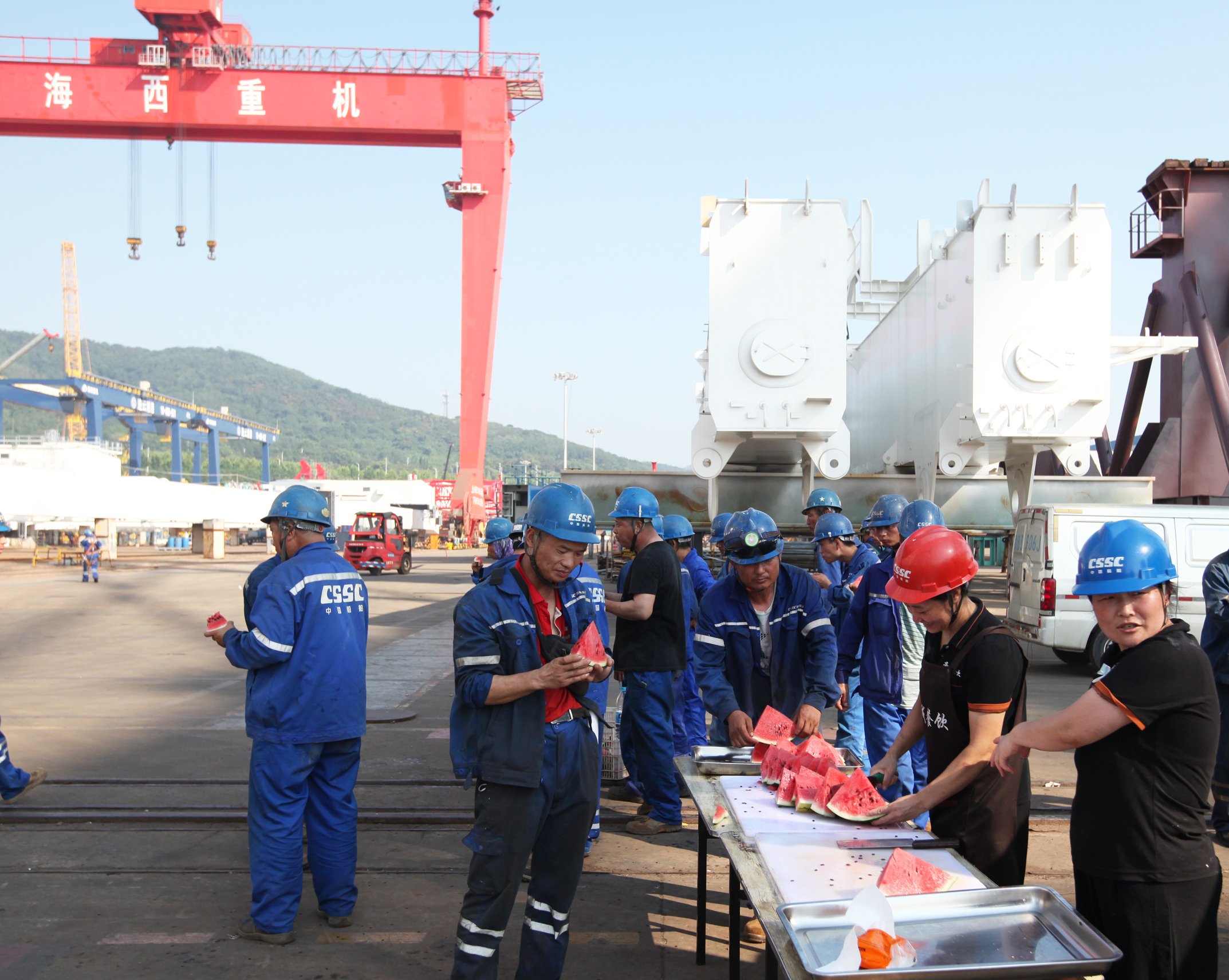 7月31日下午,武漢船機(jī)總會(huì)計(jì)師、工會(huì)主席陳世龍,海西重機(jī)總經(jīng)理蔣新標(biāo)、工會(huì)主席朱聲凱等公司領(lǐng)導(dǎo)來(lái)到生產(chǎn)現(xiàn)場(chǎng),為大家送上了解暑西瓜,表達(dá)了對(duì)一線員工的辛勤付出的感謝,叮囑大家高溫高濕天氣下要加強(qiáng)自我保護(hù),注意作息,確保平安度夏。