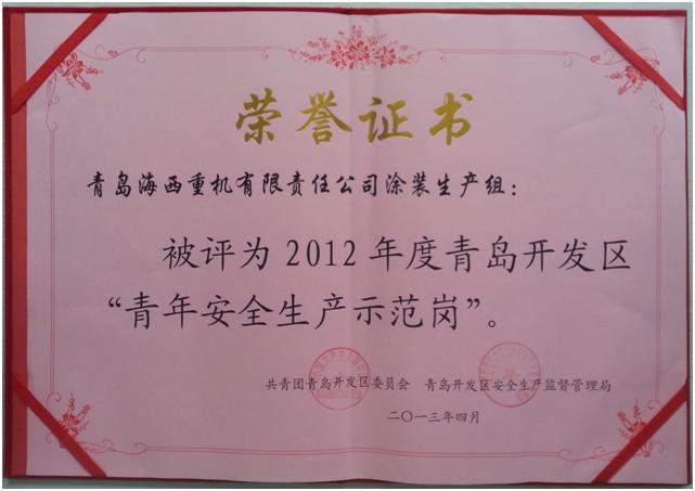 近日,青島海西重機(jī)涂裝生產(chǎn)組喜獲殊榮,獲評2012年度青島開發(fā)區(qū)“青年安全生產(chǎn)示范崗”榮譽(yù)稱號!