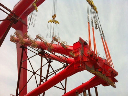 經(jīng)過一天的準(zhǔn)備,整個人字架翻身過程有條不紊:起鉤、落鉤、制動、割余量,再起鉤、落鉤、翻身、加固、摘鉤,一氣呵成。在1600T龍門吊上下小車配合下,在我部統(tǒng)籌指揮下,各部門協(xié)同作戰(zhàn),歷時僅4小時,500T人字架順利翻身,1600T龍門吊投產(chǎn)以來首戰(zhàn)告捷。