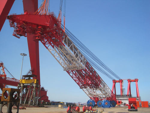 8月18日下午,青島海西重機(jī)在自己的突堤碼頭內(nèi)順利完成3600t浮吊1#臂架的最后吊裝。至此,3600t浮吊臂架安裝、鋼絲繩纏繞、臂架拉起的三步驟吊裝均已勝利完工。該臂架總重1200T,長130M,寬24米,高10米,是典型超長、超大、超重件,通過對(duì)國內(nèi)首創(chuàng)的突堤碼頭和自制1600t龍門吊的完美組合使用,海西重機(jī)自主創(chuàng)新以獨(dú)特的方式攻克了超大型構(gòu)件的吊裝以及吊裝中動(dòng)態(tài)傾斜安裝的技術(shù)難題,突破了浮吊加駁船安裝浮吊的傳統(tǒng)安裝方式,降低了安裝成本,使施工安裝風(fēng)險(xiǎn)得到充分可控,施工周期也大大縮短。